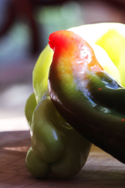 I decided that I would document this gazpacho process by sitting down at the kitchen table and watching my mom do most of the work, albeit a little bell pepper chopping. She's usually better at these things anyway. I'm better at eating